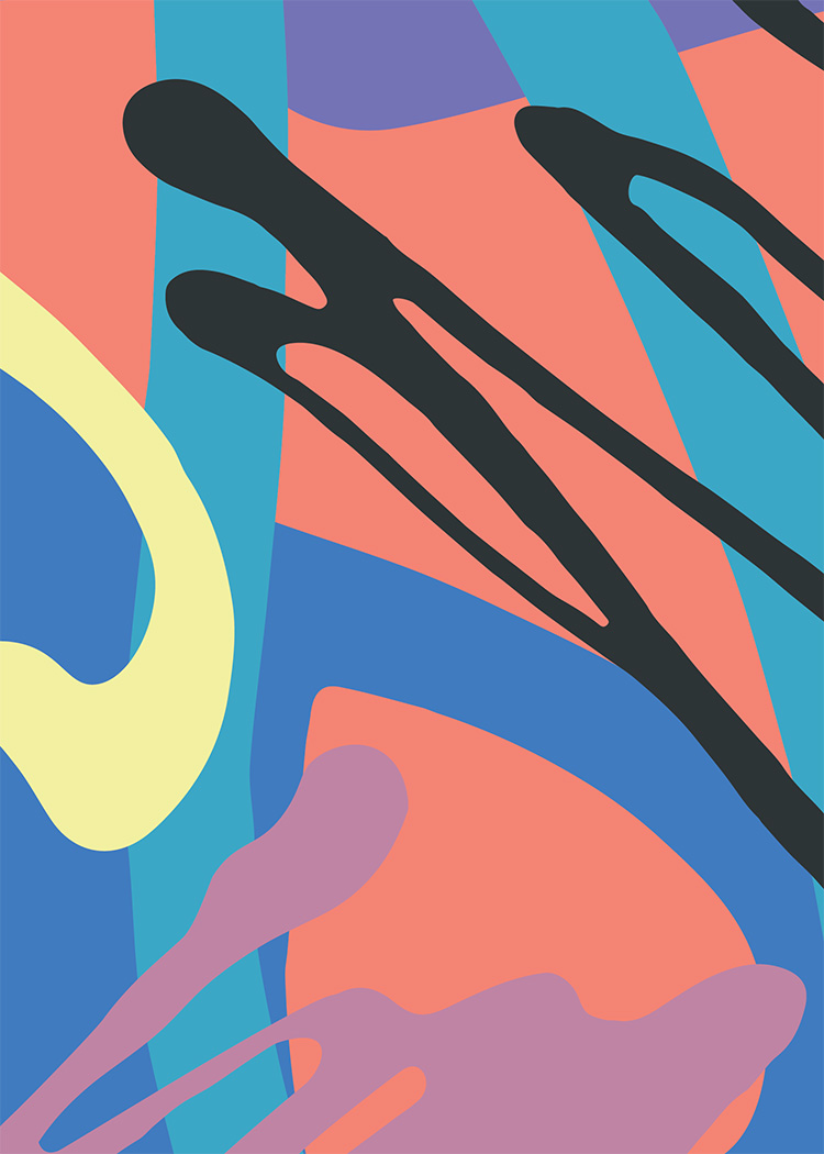 With the above goals in mind, I began the creative process by dabbling with different art forms. This base of this design is a collection of scanned, hand-made textures. After importing some random shapes and forms that I liked into Illustrator and converting to workable objects, I began arranging them, keeping an eye out for what feels and looks aesthetically inspiring. This color palette was originally divided into monochromatic works for each workout, but after more dabbling, I landed instead on changing colors of lines that were interconnected to create different feels from the same large pattern. When placed together side by side in a particular order, the underlying pattern flows onto each card (like the posters do!).